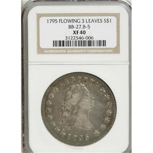 <B>1795 $1 Flowing Hair, Three Leaves XF40 NGC.</B></I> B-5, BB-27, R.1. A lovely Flowing Hair dollar with gunmetal-gray fields and ivory device highpoints. Remarkably free from abrasions, and luster glows from the stars, letters, wreath, and plumage. B-27 is the most familiar Flowing Hair dollar variety, and specialists quickly learn to identify it by the thin straight die line behind the highest hair curl. Since the 1794 is a famous rarity and Draped Bust coinage began in late 1795, type demand for 1795 Flowing Hair examples is concentrated and substantial. NGC BB-27 Census: 10 in 40, 24 finer (11/07).<BR><I>From The Parker Lee III Collection.</B></I><BR><BR><B>Coin Engraver:</B> Robert Scot<BR><BR><b>Shipping:</b> Coins & Currency (<a target="_blank" href="http://www.heritageauctions.com/common/shipping.php">view shipping information</a>)