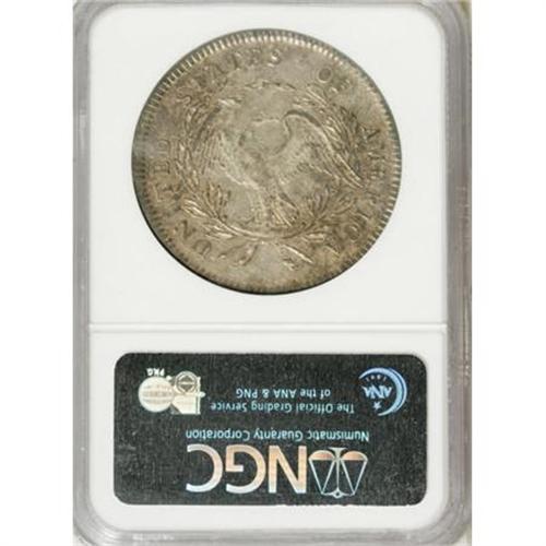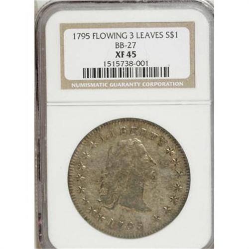 <B>1795 $1 Flowing Hair, Three Leaves XF45 NGC.</B></I> B-5, BB-27, R.1. This is the most frequently seen 1795 Flowing Hair dollar and always popular with type collectors. The giveaway diagnostic is, of course, the diagonal "bar" behind the head of Liberty. Not really a bar, this is actually a die scratch and it shows to varying degrees on B-5 dollars. It is prominent on this piece. The surfaces have mottled gray-brown toning on each side. The striking definition is a bit soft in the centers, but the fields retain a slight bit of the original reflectivity from the dies and there is just a trace of mint luster around the devices. Minimal marks for a coin that has seen 15 points of circulation.<BR><BR><B>Coin Engraver:</B> Robert Scot<BR><BR><b>Shipping:</b> Coins & Currency (<a target="_blank" href="http://www.heritageauctions.com/common/shipping.php">view shipping information</a>)