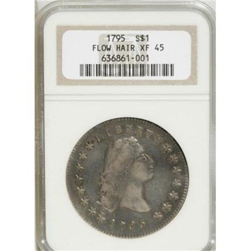 <B>1795 $1 Flowing Hair, Two Leaves XF45 NGC.</B></I> B-1, BB-21, R.1. This well-known and popular obverse die was also used to strike B-10 and B-16 dollars, and displays remnants of a 1 beneath the 7 in the date. The surfaces display even overall wear that has not, however, resulted in any distracting loss of detail. The fields show some brightness with deeper lavender-gray toning around the devices. The highpoints are brilliantish, which gives the coin sharp contrast and considerable visual appeal The peripheral features are fully defined and both sides are relatively unmarked. A couple of small spots are noted near the star 8.<BR><BR><B>Coin Engraver:</B> Robert Scot<BR><BR><b>Shipping:</b> Coins & Currency (<a target="_blank" href="http://www.heritageauctions.com/common/shipping.php">view shipping information</a>)