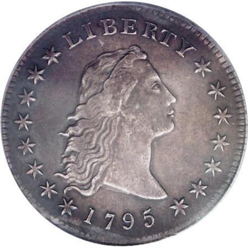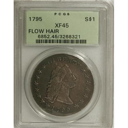 <B>1795 $1 Flowing Hair, Three Leaves XF45 PCGS.</B></I> B-6, BB-25, R.3. Dusky olive and golden-brown blend throughout this nicely detailed Choice XF Flowing Hair dollar. Adjustment marks are nearly absent, limited to a few inconspicuous lines on the obverse border between 3 and 5 o'clock. The subdued surfaces are generally smooth, since a vertical mark on the neck and a pair of faint marks near the right wreath stem are barely worthy of individual mention. The usual Three Leaves variety is Bolender-5, and although B-6 is several times scarcer, it currently carries little if any premium. Those in search of a better value type coin need look no further.<BR><BR><B>Coin Engraver:</B> Robert Scot<BR><BR><b>Shipping:</b> Coins & Currency (<a target="_blank" href="http://www.heritageauctions.com/common/shipping.php">view shipping information</a>)