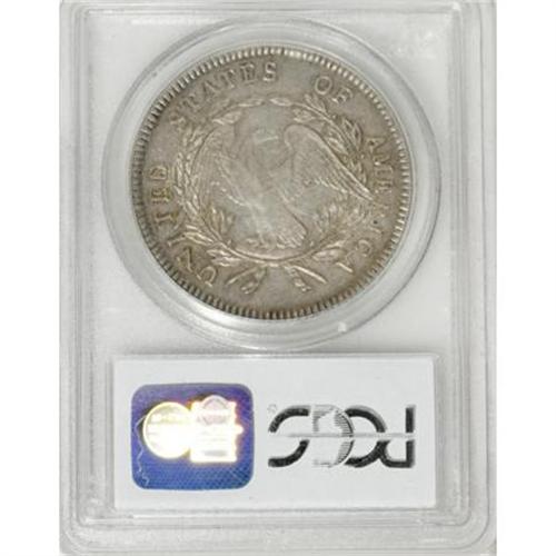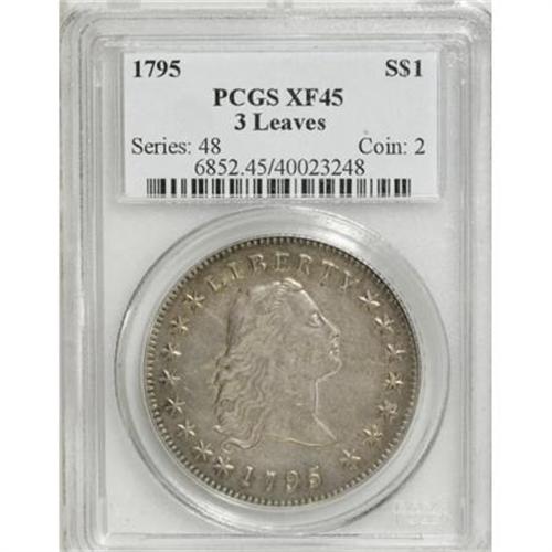 <B>1795 $1 Flowing Hair, Three Leaves XF45 PCGS.</B></I> B-5, BB-27, R.1. The thin die line or "bar" behind the highest neck curl is diagnostic for this collectible Flowing Hair variety. This is an aesthetically pleasing coin for the grade with generally problem-free surfaces. Medium intensity lilac-gray toning envelops both sides and deepens a little to olive-russet shadings around most of the devices. The strike is both well centered and sharp with plenty of definition still in evidence despite light highpoint wear. There are no noticeable adjustment marks, and the number of abrasions is minimal for a Flowing Hair Dollar that saw 15 points of wear. Nonetheless, accuracy compels us to mention a few wispy distractions on Liberty's cheek, as well as a shallow obverse scrape behind the head. A common die marriage for the issue, this coin would serve adequately as a circulated type coin.<BR><BR><B>Coin Engraver:</B> Robert Scot<BR><BR><b>Shipping:</b> Coins & Currency (<a target="_blank" href="http://www.heritageauctions.com/common/shipping.php">view shipping information</a>)