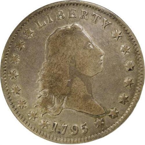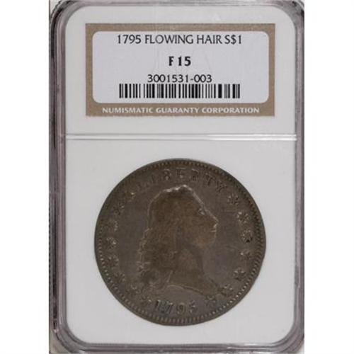 <B>1795 $1 Flowing Hair, Two Leaves Fine 15 NGC.</B></I> B-4, BB-14, R.3. Pale taupe patination uniformly covers the surfaces of this coin, although the protected recesses have retained trace amounts of original mint silver coloration. The reverse rim weakness is typical for the variety and not to be confused for wear. Barely discernable adjustment marks are noted on the eagle's breast. Overall, a pleasing Flowing Hair dollar. <BR><BR><B>Coin Engraver:</B> Robert Scot<BR><BR><b>Shipping:</b> Coins & Currency (<a target="_blank" href="http://www.heritageauctions.com/common/shipping.php">view shipping information</a>)