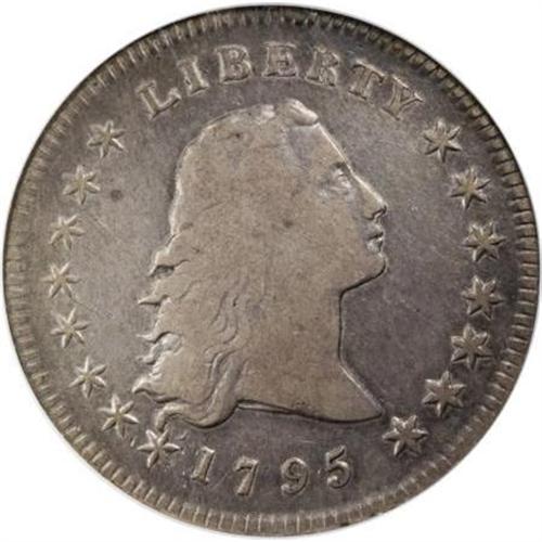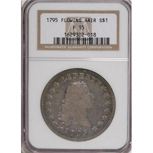 <B>1795 $1 Flowing Hair, Two Leaves Fine 15 NGC.</B></I> B-2, BB-20, R.3. The beautiful gray patina and smooth surfaces of the current coin attests to its proper handling and storage over the past 200 years. Other than a minuscule rim ding at 12 o'clock on the obverse, there are only pleasant things to say about this early dollar. The reverse die is rotated 45 degrees clockwise from the obverse die. <BR><BR><B>Coin Engraver:</B> Robert Scot<BR><BR><b>Shipping:</b> Coins & Currency (<a target="_blank" href="http://www.heritageauctions.com/common/shipping.php">view shipping information</a>)