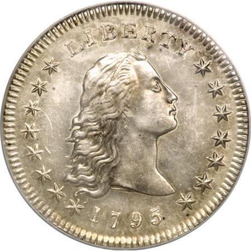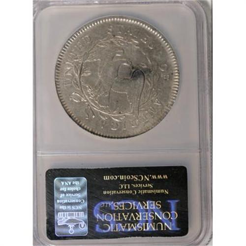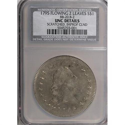 <B>1795 $1 Flowing Hair, Two Leaves--Scratched, Improperly Cleaned--NCS. Unc Details. </B></I> B-2, BB-20, R.2. Die State II. The first U.S. Mint at Philadelphia had a great deal of trouble in producing silver coinage, especially the large silver dollars. After an abbreviated mintage in 1794 of 1,758 coins, 1795 was the first year of multiple deliveries requiring the usage of more than one pair of dies. In 1993, Bowers estimated the number of survivors for this particular die variety to be 300 to 500 pieces, noting: "The variety is typically encountered in lower grades but is rare above EF." This coin has been harshly cleaned and shows a couple of fairly deep scratches in the left obverse field, but there are substantial design details remaining, unlike on the typically seen Fine example. Light hairlines and pale greenish-silver coloration are observed on each side. Stack's described this coin in their catalog as:<BR> "<B>1795 Flowing hair</B></I>. Two leaves below each wing. <B>Choice About Uncirculated</B></I>. A tiny old scratch just touching the 6th star, otherwise the coin is 'perfect.' A magnificent strike with natural prooflike surfaces. Pale golden toning."<BR><I>Ex: Stack's (3/1984), lot 1075.</B></I><BR><I>From The Queller Family Collection of Silver Dollars.</B></I><BR><BR><b>Shipping:</b> Coins & Currency (<a target="_blank" href="http://www.heritageauctions.com/common/shipping.php">view shipping information</a>)