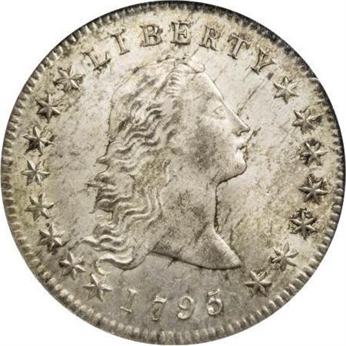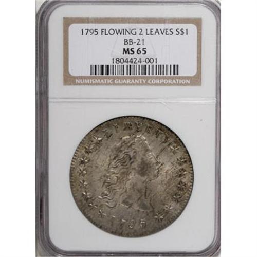 <B>1795 $1 Flowing Hair, Two Leaves MS65 NGC.</B></I> <B>1795 $1 Flowing Hair, Two Leaves MS65 NGC.</B></I> B-1, BB-21, R.1. One of the very finest known of this date and type. A remarkable coin that any numismatist will appreciate for the lustrous fields and exceptional surfaces. The strike is fairly sharp for this variety, although we note some softness on the upper curls of Liberty and on the eagle's breast feathers. There are no disturbing adjustment marks or nicks worthy of note, and it is simply amazing that any Flowing Hair silver dollar could still look this nice after 210 years. We note light gold over most of the surfaces, with darker flecks of gold adhering to the devices which seems to set them off from the brilliant fields. Both dies show minor clash marks in the fields, with the eagle's wings residing on the obverse, and portions of Liberty's curls are found left of the eagle's breast. Darker gold hues are found on the high points of the design, and these also give the present example a regal appearance. The centering is virtually perfect, and the quality of manufacture is simply as good as one could hope to find in a Flowing Hair dollar.<BR> Recall that the new dollar coining press was set up in 1795, and the current flowing hair design required more press power than was available to really bring up all the finer details of these dies. Late in 1795 the designs of the coins were changed, not because of the striking issues, but because people didn't like the flowing hair rendering of Liberty. The design change was authorized and the Philadelphia Mint engaged the famous portrait artist Gilbert Stuart to redesign the silver dollar. Stuart's drawings of Liberty are thought to have come from a portrait of Ann Willing, a Philadelphia socialite, and one of the most beautiful women in that city. Liberty was given a hair ribbon to tie some of her hair behind her head, and draped in a lovely gown. The eagle on the reverse was framed within a wreath of palm and olive branches, and given a smaller, more compact appearance. These new designs were a hit, and were quickly adopted on all United States silver coinage (obverse and reverse) and copper coinage (reverse). After a few more years in 1798 the Small Eagle reverse design was replaced with a new reverse style which was loosely copied from the Great Seal of the United States by Mint Engraver Robert Scot. Therefore, this Flowing Hair 1795 silver dollar became a very short-lived type coin, and today remains one of the most popular of all Bust dollar designs. The free flowing hair of Liberty and the proud eagle with outstretched wings symbolize the newfound freedom enjoyed by the new United States of America, and this coin seems to capture that fleeting moment in our history when our country was yet so young. Liberty's upward gaze is filled with hope, and her youthful exuberance is wonderfully captured by the early mint engraver. For the collector, the present coin represents one of the very finest examples of this entire type to survive.<BR><I>From The Madison Collection.</B></I><BR><BR><B>Coin Engraver:</B> Robert Scot<BR><BR><b>Shipping:</b> Coins & Currency (<a target="_blank" href="http://www.heritageauctions.com/common/shipping.php">view shipping information</a>)