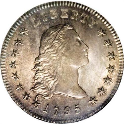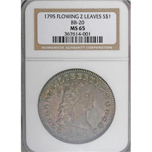 <B>1795 $1 Flowing Hair, Two Leaves MS65 NGC.</B></I> B-2, BB-20, R.3. The 1795 B-2 dollar is a slightly scarcer die combination, certainly harder to locate than either B-1 or B-5, the two commonest 1795 Flowing Hair dollar varieties. Current estimates place the total number of survivors of the B-2 variety at someplace between 200 and 500 coins, most likely at about the midpoint of that range. Most of the survivors fall in the Fine 15 to XF40 grade range. Few remain in the AU grades, and Mint State examples are very rare. Only two examples of the 1795 B-2 dollar have claims to Gem condition: one is the George Earle-Louis Eliasberg Coin, and the other is this piece, from the Heifetz and Cardinal Collections. It appears that there are about eight to 10 Mint State pieces of the variety known, including two pieces from the Lord St. Oswald Collection.<BR><BR> Dave Bowers divided the coinage of 1795 Flowing Hair and Draped Bust coins into six different striking periods. He placed the B-2 dollar in the second striking period, which he suggested actually took place in 1795. Some other striking periods are known to include coins minted as late as 1798. The evidence for B-2 as part of the second period is the existence of the two St. Oswald coins, said to be acquired from the Mint in Fall 1795.<BR><BR> The obverse was used to produce B-2 and B-19 dollars, the latter considered unique. It is an example of the Head of '95, identified by a conspicuous loop on the base line below the shoulder, usually called a shoulder loop. It is branded with a raised diagonal bar just inside the inner point of star 4. Star 1 pierces and severs the lowest hair curl, the curl's right end appearing as a curved island in the field. Stars 12 and 13 are slightly closer than the other star pairs. The date is widely spaced with 95 slightly closer, and the 9 tipped slightly to the right.<BR><BR> The reverse was used to produce B-2, B-1, and B-13 dollars, apparently in that order. The reverse die was rotated clockwise about 45 degrees when this example was minted. It is a Two Leaves die with nine berries in the left branch and 10 in the right branch. The eagle has six tail feathers (some others have just five tail feathers. There are two inside berries and one outside berry below the left facing wing; three inside berries and one outside berry beneath the right facing wing. The legend has the first S slightly low, the A slightly high, and the final S slightly low. The I is distant from the eagle's wing, the T close, the E close, and the R touches.<BR><BR> Numerous fine die finishing lines are visible in the lower right obverse field, especially right of the neck and above the bust tip. The die has been lightly lapped, and stars 3 through 6 are weaker than the remaining stars. Bowers called these lapped stars "spidery." A fine die crack is hidden in the hair, crossing five individual stands of the top two locks. Faint clash marks appear as projections or points extending out from the hair curls. These are in the form of tiny leaf points. The reverse appears to be perfect, however, close examination shows what appears to be a short vertical die crack from the middle talon on the right, down to the ribbon knot.<BR><BR> Among 1795 Flowing Hair dollars with the Two Leaves reverse, this piece ranks among the finest, regardless of die variety. The cataloger for the Cardinal Collection notes that it ranks behind only the Earle-Eliasberg "presentation" piece for overall quality among coins of this type. This is an amazing coin with pristine surfaces that are marred only by a faint scratch on the obverse, in the field left of stars 12 to 14. Otherwise, there are no discernable marks on either side. Both sides are highly lustrous with full cartwheel luster and brilliant satin surfaces beneath lovely golden-brown color, hints of violet toning, and sky blue iridescence. The obverse has some light central adjustment marks across Liberty's hair that have caused some slight central weakness on the reverse. Otherwise all aspects of the strike are complete and bold, including individual details that seldom observed. For example, the stem of the leaf pair below M crosses half of the eagle's wing. Only the level of strike permitted viewing of the die crack in Liberty's hair, mentioned earlier.<BR><I>Ex: Jascha Heifetz Collection (Superior, 10/1989), lot 3815; Cardinal Collection (American Numismatic Rarities, 6/2005), lot 11.</B></I><BR><BR><B>Coin Engraver:</B> Robert Scot<BR><BR><b>Shipping:</b> Coins & Currency (<a target="_blank" href="http://www.heritageauctions.com/common/shipping.php">view shipping information</a>)