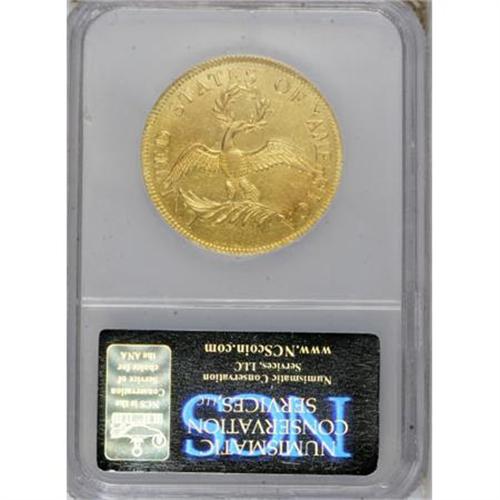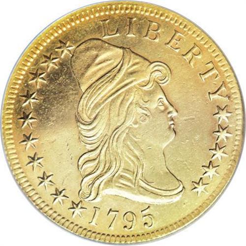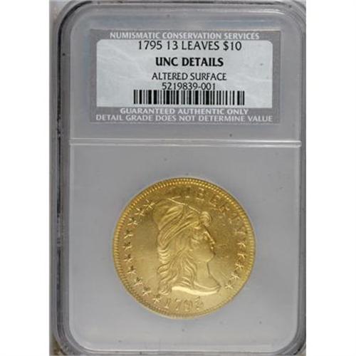 <B>1795 $10 13 Leaves--Altered Surface--NCS. Unc. Details.</B></I> 13 Leaves, Breen-6830, Taraszka-4, BD-4, R.5. BD-4 is the rarest 13 leaf 1795 variety, edging out the also scarce BD-5. The majority of 13 leaf 1795 tens are BD-1, although BD-2 shows up regularly as well. BD-4 is promptly identified by the location of star 10, which virtually touches the cap. Another useful diagnostic is the large die lump on the reverse at 2 o'clock, although this lump is also seen on BD-5, since both varieties share the same reverse die. Designated as Uncirculated Details by NCS, the present example has minor gray-tinged flatness on the eagle's breast and neck, but the overall strike is sharp. Faint hairlines are detected with a loupe and patience, and the selected portions of the fields are glossy, mostly beneath the eagle's head and on each side of the portrait. Faint, parallel, and mint-made adjustment marks are limited to the upper reverse border.<BR> 1795 was the first year of gold production at the First Philadelphia Mint. High surety bonds limited 1793 coinage to copper cents and half cents. The bonds were reduced to allow silver half dimes, half dollars, and dollars in 1794. Finally, half eagles and eagles were struck in 1795, while quarter eagles had to wait until 1796 for their turn. 1795 half eagles are more plentiful than their ten dollar counterparts, which is understandable given the imposing purchasing power of the latter denomination. Eagles of the initial Capped Bust Right, Small Eagle type were only coined between 1795 and 1797, and have a combined mintage of only 13,344 pieces. Most were melted before 1834, when the weight of gold coins was reduced to allow belated domestic circulation.<BR><BR><B>Coin Engraver:</B> Robert Scot<BR><BR><b>Shipping:</b> Coins & Currency (<a target="_blank" href="http://www.heritageauctions.com/common/shipping.php">view shipping information</a>)