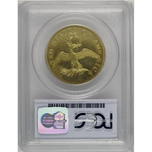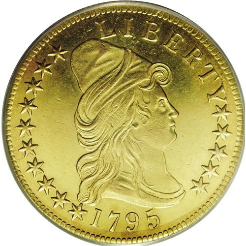 <B>1795<$10> 13 Leaves MS61 PCGS.</B></I> Breen-6830, B. 1-A, Taraszka-1, R.3. Although it was not the first gold coin produced by the Philadelphia Mint, the 1795 eagle was an important coin in the history of U.S. numismatics. This issue introduced the American citizenry to the eagle, or ten dollar gold piece. An impressive coin (the first examples weighed 17.5 grams and measured approximately 33 millimeters), the eagle was the largest federal gold coin in terms of both size and face value before the introduction of the double eagle in 1850. Robert Scot prepared four pairs of dies for the 1795 issue, but one of the reverse dies remained unused until it was paired with a 1796-dated obverse. This premier issue was produced to the extent of a mere 5,583 coins, all of which were delivered between September 22, 1795 and March 30, 1796. Although a limited number of high grade 1795 eagles were saved as novelty items, Breen (1988) states that only 3% of the original mintage survives today. Most extant examples grade VF through AU.<BR> The B. 1-A variety is easily identified by the extension (die scratch) at the top left of the Y in LIBERTY. This Uncirculated representative displays the semi-prooflike finish that characterizes many high grade 1795 Small Eagle half eagles and eagles. The surfaces are green-gold in color with scattered abrasions. These features are, however, consistent with the grade. The strike is average for the issue and all major devices are well detailed. There are a few well concealed adjustment marks in Liberty's hair. An important bidding opportunity for the high quality collector.