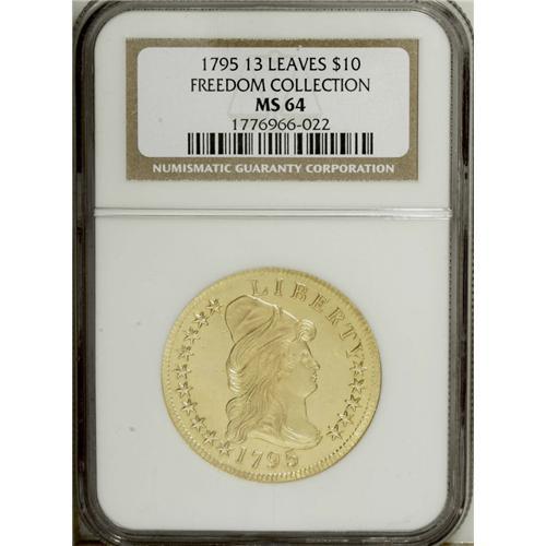 <B>1795 $10 13 Leaves MS64 NGC.</B></I> Breen 1-A, Breen-6830, Taraszka-1, Bass-3169, BD-1, High R.3. The ten dollar gold pieces, given the name "eagle," were the largest gold coins produced by the first U.S. Mint from 1795 through 1804. Like all early gold coins, these pieces did not carry an actual denomination as part of the design. John Dannreuther explains: "The eagle was the second gold denomination struck by the United States Mint. Calling it a <I>denomination</B></I> is actually a misnomer. Even though a gold eagle was denominated as a ten-dollar coin, our forefathers traded gold by the tale. Tale, in this instance, means count or tally, a number of things taken together (i.e., the weight and purity of an individual coin). The weight and purity were the only things important to merchants and individuals--money was gold, and gold was money. In most cases, transactions of even a nominal sum had to be settled in gold, especially whenever governments were involved. There really was no need at first for a stated denomination on either gold or silver coins, because it was known that our coins would be under extreme scrutiny and would likely be assayed by foreign mints and others as to their weight and purity."<BR> A similar problem exists for both the half eagles and the eagles. For both denominations there were multiple varieties dated 1795 and only a single variety dated 1796, despite mintages that suggest this is illogical. During the course of 1795, just 2,795 eagles were minted from September 22 through November 27. In 1796, the Mint produced 6,934 eagles from January 9 through December 22. If we take these annual production totals at face value, an average of 560 coins per die marriage were struck in 1795 while a single die marriage produced all 6,934 coins in 1796. Clearly there is something wrong, unless many of the coins produced in 1796 were from dies dated 1795, and we can be certain that this was the case. According to the <I>Guide Book,</B></I> the 1795 mintage totaled 5,583 coins and the 1796 mintage totaled 4,146 coins, but even these figures are suspect, suggesting a survival rate of 10% for 1795 eagles and only 4% for 1796 eagles. This discussion illustrates the challenge that numismatists have today when attempting to reconstruct the events of the earliest years at the Philadelphia Mint. There were no records of mintages for individual die varieties, and any attempt to make such estimates today is plagued with problems.<BR> In his new reference, <I>Early U.S. Gold Coin Varieties,</B></I> Dannreuther provides estimated mintages for every variety, as well as estimates of the number of survivors for each variety. The only thing we know for sure is the number of die marriages known from 1795 through 1804 (32) and the total mintage for that period (132,714 coins including 122 pieces reserved for assay). By using the midpoint of Dannreuther's survival estimates, we can also establish an approximate survival rate for the series of 2.5%. Is this enough information to establish original "mintage figures" for each variety or even for each coinage date? This cataloger has spent considerable effort over several years attempting to correlate mintage figures with individual varieties, and now feels that it is not possible. There are at least two variables that cannot accurately be determined. First, the exact emission sequence needs to be determined (including both die marriages and remarriages). In a series like the early eagles, the emission sequence alone is enough to give a numismatist nightmares. Once the emission order is known, an accurate estimate of the survivors must be established for each variety and remarriage, and this is nearly an impossibility. Finally, differing survival rates from one coinage date to the next must be pinpointed, a seemingly impossible task.<BR> The 1795 BD-1 is considered the first variety coined for the year, therefore it is the first eagle minted by the United States! There are more of these surviving today than all other 1795 varieties combined, and it is actually one of the five most common die varieties of the entire series from 1795 to 1804, a fact that would probably surprise most collectors. Quite a few examples survive in Mint State grades, giving collectors a reasonable chance of obtaining a high-quality example of the Small Eagle reverse design. Many of the Mint State pieces have prooflike fields, much like this coin does. Although the fields are not deeply mirrored, they are clearly reflective. The surfaces are exceptional and almost totally mark-free with only a few scattered abrasions. Faint adjustment marks are evident at the center of the obverse, and also on some of the obverse dentils. All of the design elements on both sides are sharply struck, suggesting to some the possibility that this may have been some type of presentation piece. This example is a relatively early die state of the variety, with faint obverse die cracks but no evidence of any reverse cracks. Despite the existence of several Mint State pieces, this example is one of the best we have handled. In fact, in our previous sales we have only handled two 1795 eagles in grades better than MS61! Census: 4 in 64, 4 finer (10/06).<BR><I>From The Freedom Collection.</B></I><BR><BR><b>Shipping:</b> Coin/Currency (<a target="_blank" href="http://www.heritageauctions.com/common/shipping.php">view shipping information</a>)