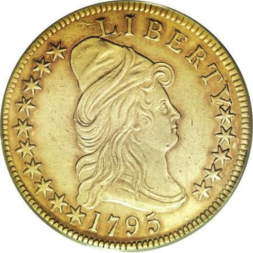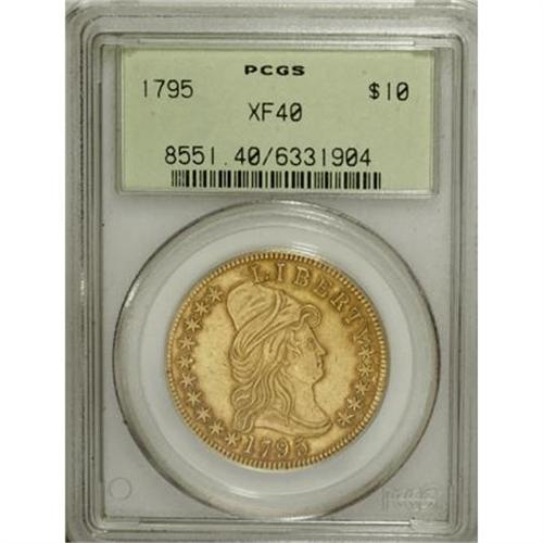 <B>1795 $10 13 Leaves XF40 PCGS.</B></I> Breen-6830, Taraszka-1, BD-1, High R.3. An early die state without the cracks from star 5 through star 9, and without the cracks from the T and D in UNITED or the M and ER in AMERICA. Die link studies by Harry W. Bass, Jr., Anthony Taraszka, and John Dannreuther have confirmed that BD-1 was the first of the five die marriages struck, and thus the first ten dollar variety. The ten dollar, or eagle, was the second gold denomination coined, close on the heels of the five dollar half eagle.<BR> Dannreuther estimates in his recently published <I>Early U.S. Gold Coin Varieties </B></I>that 200 examples exist of BD-1, which makes the variety very scarce, yet collectible by the determined numismatist. The comparative rarity of the 1796 and 1797 Small Eagle, as well as the BD-2 through BD-5 1795 marriages, focuses type demand on the Small Eagle design on BD-1. <BR> This is a pleasing example of this elusive early large denomination gold type. Original golden-honey luster outlines all legends, stars, and devices, and also fills the crevices of the eagle's plumage and Liberty's hair, cap, and drapery. A few minor adjustment marks (as made) are present near the wreath, but significant post-strike abrasions are limited to a thin line on the cheek, a tiny depression near the Y in LIBERTY, and a few closely spaced marks on each side of the L in LIBERTY. Given the substantial remaining luster, and the considerable definition on the eagle's breast feathers, the desirability of the present piece needs no further elaboration. Encapsulated in an old green label holder.<BR><I>From The Chandler Collection.</B></I><BR><BR><B>Coin Engraver:</B> Robert Scot<BR><BR><b>Shipping:</b> Coins & Currency (<a target="_blank" href="http://www.heritageauctions.com/common/shipping.php">view shipping information</a>)