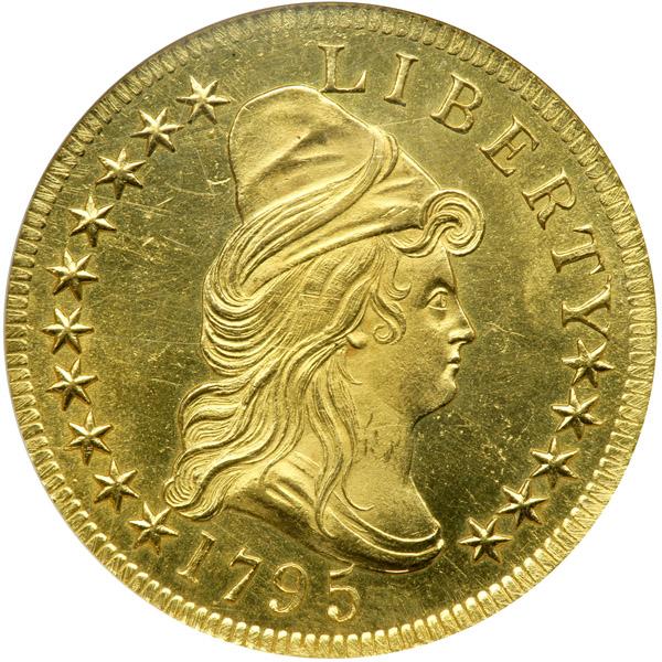 What a low survival ratio! It is no wonder coins like this are the crème de la crème of numismatics in 21st Century America. BD-1 is considered to be the first variety struck in 1795. "Quite a few examples survive in Mint State grades," explains the Freedom Collection description, "giving collectors a reasonable chance of obtaining a high-quality example of the Small Eagle reverse design. Many of the Mint State pieces have Prooflike fields, much like this coin does. Although the fields are not deeply mirrored, they are clearly reflective. The surfaces are exceptional and almost totally mark-free with only a few scattered abrasions. Faint adjustment marks are evident at the center of the obverse, and also on some of the obverse dentils. All of the design elements on both sides are sharply struck, suggesting to some the possibility that this may have been some type of presentation piece. This example is a relatively early die state of the variety, with faint obverse die cracks but no evidence of any reverse cracks. Despite the existence of several Mint State pieces, this example is one of the best…" and indeed it is, an incredible coin, and a first-class opportunity for the earnest buyer of rare United States gold coinage! Pop 5; 3 finer by a point. (PCGS # 8551) .