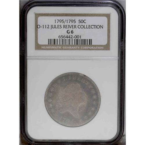 <B>1795/1795<50C> Doubled Date, 2 Leaves. O-112, R.4. Good 6 NGC.</B></I> This is a plentiful variety, one of the common die marriages of the year. It is also a popular blundered date variety with increased demand due to its listing in the <I>Guide Book.</B></I> An early die state with only a trace of the usually bold crack between ER in LIBERTY, appearing as a faint line between the dentils. The clash marks from the O-111 marriage are present, and bookend the forehead curl, appear beneath the nose, and emerge behind Liberty's head. Rich peach, lavender, and sea-green toning. A few wispy but sometimes bright hairlines cross the obverse. Minor rim dings are noted at 12 o'clock on the obverse and at several points on the reverse.<BR><I>Ex: Julian Leidman (8/21/1981).</B></I> Envelope Included.