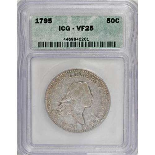 <B>1795/1795 50C VF25 ICG.</B></I> O-112a, R.4. Late die state with a thick die crack that extends from the upper obverse rim between ER, angling down to the top of Liberty's head--reappearing on this example beneath the ear and attached to it just above the earlobe. The date is double punched, with the first entry very low, and corrected such that the second placement leaves the final date position much higher. The lower halves of the numerals from the first date position show clearly beneath, touching the border. BE in LIBERTY is also recut.<BR>A pleasing, natural appearance is presented on each side, with toning variations that range from pearl-gray and sky-blue to turquoise and golden-brown near the borders. Numerous wispy hairlines reside on the obverse; fewer are noted on the reverse. The highpoints of the design exhibit an appropriate degree of wear for the grade.<BR>PCGS# 6055; Encyclopedia-4562.<BR><I>Ex: Harry Laibstain (1/2002).<BR>From The Westmoreland County Collection of Early Bust Halves, 1794-1807.</B></I><BR><BR><B>Coin Engraver:</B> Robert Scot<BR><BR><b>Shipping:</b> Coins & Currency (<a target="_blank" href="http://www.heritageauctions.com/common/shipping.php">view shipping information</a>)