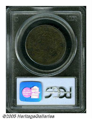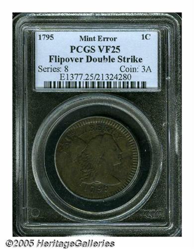 <B>1795<1C> Lettered Edge--Flipover, Double Strike--VF25 PCGS.</B></I> S-76a, R.5. A bold if faintly granular light brown example. The initial strike was about 20% off center toward 3 o'clock, Liberty's profile (visible despite the second strike) approaches the rim. This error was detected, and the piece was struck again with proper centering. The fraction from the initial strike remains bold on the top of Liberty's cap, the latter from the second strike. Although Sheldon-76 is usually located with a plain edge, there is no doubt the present piece is the far scarcer lettered edge variety, since the lettering can be discerned (albeit distorted) through the PCGS holder. This piece is the plate coin in the Flipovers category in the Oops chapter of Breen's Large Cent Encyclopedia, page 843.<BR><I>Ex: 1977 ANA Sale, Kagin's, lot 4467; C. Douglas Smith; Denis Loring 1/30/79; R. E. Naftzger, Jr.; Chris McCawley; Michael Arconti (Superior, 7/03), lot 11.</B></I>
