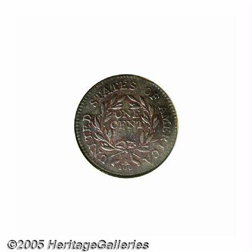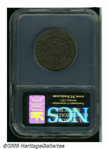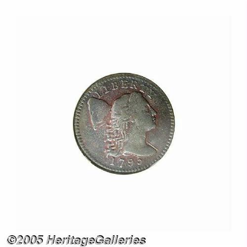 <B>1795<1C> Plain Edge AU Details, Improperly Cleaned, NCS.</B></I> S-76b, R.1. A small mint-made curved clip at 5 o'clock is of interest to the mint error collector. Luminous olive and brick-red colors are not natural, but this piece is attractively defined and has no distracting marks. ONE CENT is entered high within the wreath for this popular Sheldon marriage.