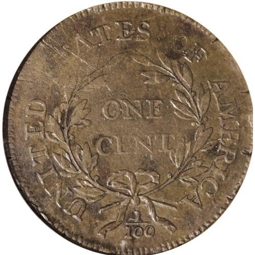 <B>1795<1C> Plain Edge AU53 NGC.</B></I> S-77, R.3. A pleasing light olive-brown example of this variety that is usually seen with darker surfaces. This particular piece has some light surface marks, including original planchet marks and later blemishes. A few small scratches are noted on the reverse. EAC 30.