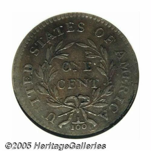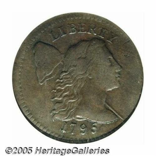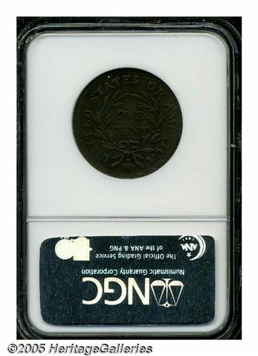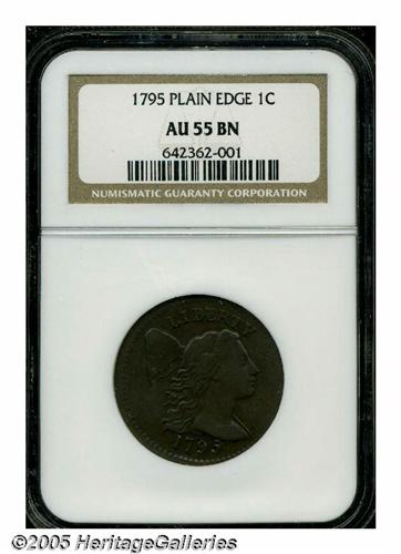 <B>1795<1C> Plain Edge AU55 NGC.</B></I> S-78, R.1. Just the slightest rub is evident over the highpoints of the design elements; however, the devices are a bit softly struck. Struck just slightly off center with some of the denticles missing on the right portion of the rims on each side. Only lightly abraded, except for a recent, shallow scratch on the lower right portion of the reverse.