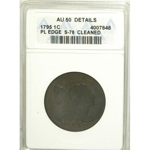 <B>1795 1C Plain Edge--Cleaned--ANACS. AU50 Details.</B></I> S-78, B-8, R.1. One of the more available issues of the year, distinguished by the placement of the T and Y in LIBERTY. While the devices of this teak-brown example show an excellent level of definition and only minor wear, the surfaces show evidence of a past cleaning, which necessitates the details grade. EAC 20.<BR><BR><B>Coin Engraver:</B> Joseph Wright<BR><BR><b>Shipping:</b> Coins & Currency (<a target="_blank" href="http://www.heritageauctions.com/common/shipping.php">view shipping information</a>)