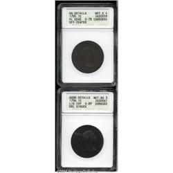 <B>1795<1C> Plain Edge--Corroded, Off-Center--ANACS, VG Details, Net Good 4,</B></I> S-78, R.1, struck about 10% off center toward 9 o'clock, a rough piece with reddish verdigris on the portrait; and a <B>1796 Liberty Cap--Damaged, Double Struck--ANACS, Good Details, Net AG3,</B></I> S-89, High R.3, the peak of the cap and the bust truncation is widely doubled, a pinscratch at 9 o'clock, minor edge damage at 1 o'clock, dark and somewhat granular. 2 Coins <BR><BR><B>Important notice:</B> Heritage usually auctions material at the rate of 200-250 lots per hour. On some occasions eBay Live bid software or the Internet may not be able to keep up with the pace of the auction. We recommend placing a realistic absentee bid now as insurance to avoid disappointment. Occasionally the auctioneer may eliminate or reject an eBay Live bid, and the auctioneer may also reopen a lot after the close of the eBay live bidding (usually because we missed an audience bid), and may reject your bid even if it shows you as the winning bidder. By bidding via eBay Live, you agree that Heritage may award the lot to another bidder at its sole discretion under the circumstances described above or any other reasonable circumstances. Since eBay bids are not shown to us until we open the lot on the floor, we treat those bids just like floor bids. In most cases the floor responds before the eBay bid is presented to us, due to Internet lag time, so for consistency we have made it a policy that floor bids are always considered first over tie eBay live bids. Also please note that all Heritage lots purchased through eBay Live carry a 20% Buyer's Premium. Please make sure you read the Terms and Conditions before you bid. </span></font></tr></table></td></tr></table>
