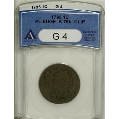 <B>1795 1C Plain Edge --Clip--Good 4 ANACS.</B></I> S-76b. NGC Census: (2/103). PCGS Population (12/253). Mintage: 501,500. Numismedia Wsl. Price for NGC/PCGS coin in G4 : $154. (#1380)<BR><BR><B>Coin Engraver:</B> Joseph Wright<BR><BR><b>Shipping:</b> Coins & Currency (<a target="_blank" href="http://www.heritageauctions.com/common/shipping.php">view shipping information</a>)