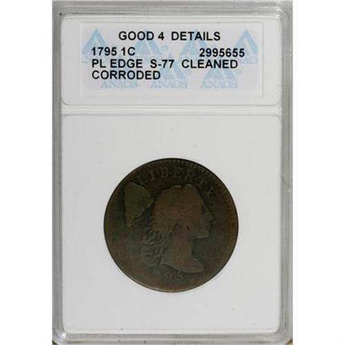 <B>1795 1C Plain Edge--Cleaned, Corroded--ANACS. Good 4 Details.</B></I> S-77. NGC Census: (4/99). PCGS Population (9/242). Mintage: 501,500. Numismedia Wsl. Price for NGC/PCGS coin in G6 : $202. (#1380)<BR><BR><B>Coin Engraver:</B> Joseph Wright<BR><BR><b>Shipping:</b> Coins & Currency (<a target="_blank" href="http://www.heritageauctions.com/common/shipping.php">view shipping information</a>\)