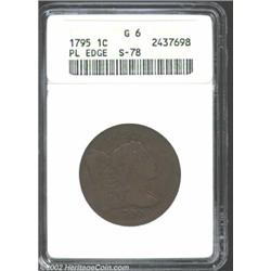 1795 1C Plain Edge Good 6 ANACS. S-78, R.1. Unevenly worn with much of the reverse worn into the rims. Pleasing color. Important notice: We expect to be auctioning lots at the rate of 200-250 per hour. Sometimes eBay Premier live bid software cannot keep up with that pace, so we strongly recommend that you place a realistic proxy bid now as insurance to avoid disappointment. Also please note that all Heritage/CAA lots purchased through eBay Premier carry a 20% Buyer's Premium. Please make sure you read the Terms and Conditions.