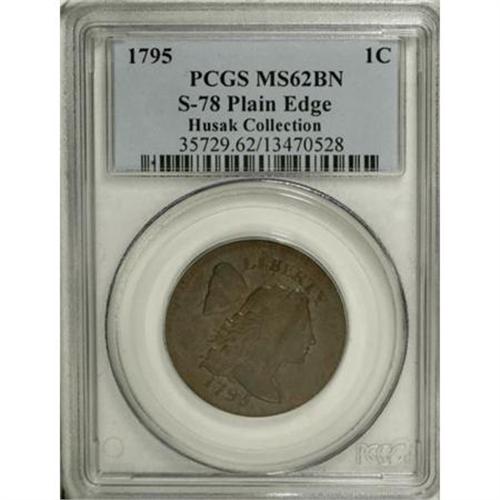 <B>1795 1C Plain Edge. MS62 Brown PCGS. S-78, B-8, R.1. </B></I> <B>Noyes AU55; CC-11. Photo #28709. Our EAC Grade AU55.<BR><BR>Equivalents.</B></I> Proskey 7; Doughty 70; McGirk 5A, 5B, 5C; Clapp-Newcomb 6; EAC 7; <I>Encyclopedia </B></I>1676; PCGS #1380.<BR><B><BR>Variety. </B></I>Date and LIBERTY are closely spaced. ONE CENT centered in wreath and widely separated. The obverse appears on S-78. The reverse appears on S-78. Plain Edge.<BR><B><BR>Surfaces. </B></I>Frosty surfaces retain nearly full cartwheel luster with slight reflectivity in the fields. Both sides have numerous tiny prestrike planchet nicks, and only a few other blemishes. Pleasing tan color with splashes of darker brown and minor reddish stains.<BR><B><BR>Die State V.</B></I> Several sets of weak clash marks are visible. Breen suggests that all clash marks are gone and the dies are polished, giving the surfaces a prooflike appearance that is seen here. Either the dies reclashed, or the die polishing procedure did not remove them entirely. Minor die buckling is visible in the right obverse field.<BR><B><BR>Appearances.</B></I> The obverse and reverse are illustrated in Noyes (2007).<BR><B><BR>Census.</B></I> A common variety that is usually available in all grades, although Mint State coins can be elusive.<BR><B><BR>Commentary.</B></I> According to Breen, reverse F (S-78) is "a Gardner die copying reverse C." Reverse C is found on S-76b. If Breen is correct, Gardner's talents were poorly utilized copying the work of others.<BR><BR><B>Provenance.</B></I> <I>M.A. Brown (Chapman Brothers, 4/1897), lot 764; Ed. Frossard; Allison Jackman (Henry Chapman, 6/1918), lot 704; S.H. Chapman; later, Frank H. Masters, Jr. (RARCOA, 5/1971), lot 88; Milton Bentley; Stack's (3/1986), lot 1017, $3,520; Anthony Terranova; Herman Halpern; Denis W. Loring (5/1986); Robinson S. Brown, Jr. (Superior, 1/1996), lot 111, $7,975.</B></I><BR><BR><B>Personality.</B></I> <B>Robinson S. Brown, Jr.,</B></I> holds a unique place in the history of large cent collecting, assembling a complete collection of Sheldon numbered varieties on two different occasions. He was born in 1917 and spent five decades with Brown-Forman Distillers of Louisville, Kentucky, most famous for Jack Daniel's whisky. He retired as chairman of the board in 1982. Superior sold his first collection of large cents (1793-1857) in 1986 and his second collection (1793-1839) a decade later. The third Superior sale of coins from the Brown collection consisted of only late-date cents, auctioned in 2002. Brown died on July 28, 2005.<BR><BR><B>Sheldon-79.</B></I> Y entirely over forelock. Leaf triplet below OF. The obverse appears on S-79. The reverse appears on S-79. Reeded Edge.<BR><BR>Sheldon-79 is one of just three Sheldon numbers missing from the Husak Collection. The others are the 1793 Sheldon-15 and the 1795 Jefferson Head (S-80). The Reeded Edge cent is the most coveted Sheldon number of the entire series. Just six examples are known, including one that is a brockage with a hole. The finest known grades just VG8. Some numismatists consider the Reeded Edge to be a pattern or experimental coin.<BR><BR><B>Sheldon-80.</B></I> Jefferson Head. Long ribbons. The obverse appears on S-80, NC-1, and NC-4. The reverse appears on S-80 and NC-4.<BR><BR>Sheldon-80 is one of just three Sheldon numbers missing from the Husak Collection. The others are the 1793 Sheldon-15 and the 1795 Reeded Edge (S-79). The Jefferson Head is believed a private production of John Harper in connection with his proposal to provide the nation with contract coinage. There are some who consider the Jefferson Head nothing more than a contemporary counterfeit, although most advanced students of the series classify the coin as a private pattern produced in support of a proposal to government.<BR><BR><b>Shipping:</b> Coins & Currency (<a target="_blank" href="http://www.heritageauctions.com/common/shipping.php">view shipping information</a>)