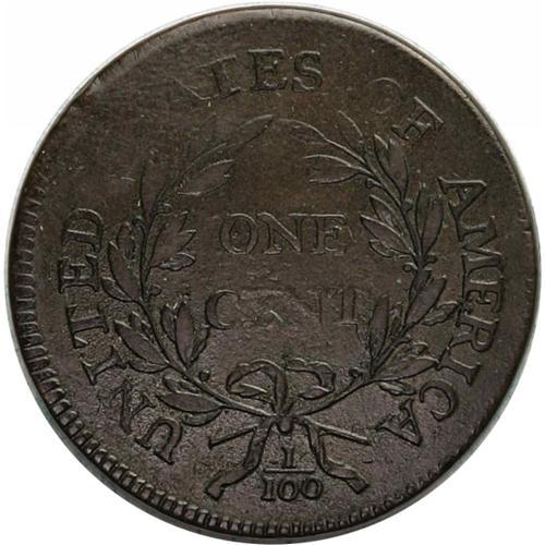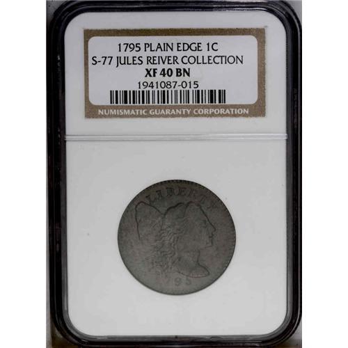 <B>1795<1C> Plain Edge. S-77, B-6, High R.3. XF40 NGC. VF30 EAC.</B></I> A later intermediate die state with a crack past the final A to the nearby berry and up to the leaf at NT. This die crack is very faint. Mottled steel and olive color with generally pleasing surfaces. A few tiny blemishes are noted on each side.<BR> Note: the Reiver Collection does not include an example of S-78, a common variety. Also, the extremely rare S-79 Reeded Edge cent is not included.<BR><I>Ex: Unknown Mayflower sale, lot 327; George Ramont (12/4/1969).</B></I> Envelope Included.