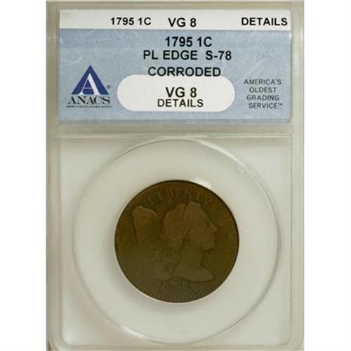 <B>1795 1C Plain Edge--Corroded--ANACS. VG8 Details.</B></I> S-78. (#35729)<BR><BR><b>Shipping:</b> Coins & Currency (<a target="_blank" href="http://www.heritageauctions.com/common/shipping.php">view shipping information</a>)