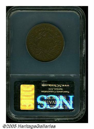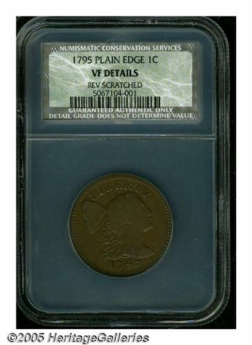<B>1795<1C> Plain Edge VF Details, Reverse Scratched, NCS.</B></I> S-76b, R.1. The obverse is beautiful and has surprisingly undisturbed chocolate-brown surfaces. The reverse has identical color and similar pleasing definition, however many toned over threadlike pinscratches appear when viewed beneath a glass.