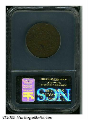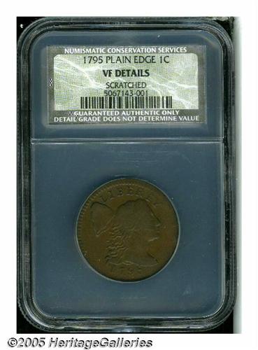 <B>1795<1C> Plain Edge VF Details, Scratched, NCS.</B></I> S-76b, R.1. A light golden-brown Large Cent with pleasing detail. A few wispy pinscratches are evident on the obverse when viewed under a glass. The reverse has a spot on the right ribbon loop and a small rim bruise at 12 o'clock.