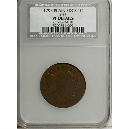 <B>1795 1C Plain Edge--Graffiti--NCS. VF Details.</B></I> NGC Census: (2/72). PCGS Population (19/168). Mintage: 501,500. Numismedia Wsl. Price for NGC/PCGS coin in VF20: $1,125. (#1380)<BR><BR><B>Coin Engraver:</B> Joseph Wright<BR><BR><b>Shipping:</b> Coins & Currency (<a target="_blank" href="http://www.heritageauctions.com/common/shipping.php">view shipping information</a>)
