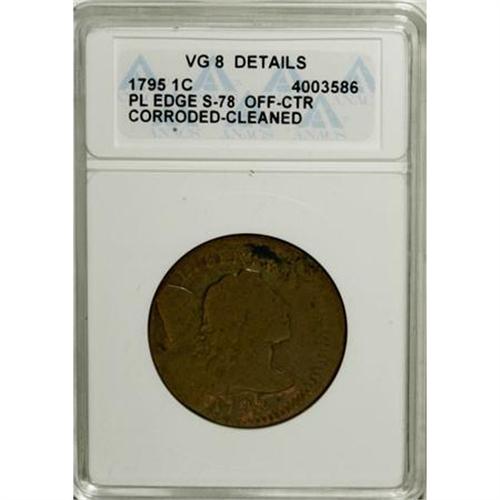 <B>1795 1C Plain Edge--Cleaned, Corroded, Off Center--ANACS. VG8 Details.</B></I> S-78. NGC Census: (3/96). PCGS Population (13/230). Mintage: 501,500. Numismedia Wsl. Price for NGC/PCGS coin in VG8 : $292. (#1380)<BR><BR><B>Coin Engraver:</B> Joseph Wright<BR><BR><b>Shipping:</b> Coins & Currency (<a target="_blank" href="http://www.heritageauctions.com/common/shipping.php">view shipping information</a>)
