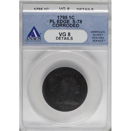 <B>1795 1C Plain Edge--Corroded--ANACS. VG8 Details.</B></I> S-78. NGC Census: (3/96). PCGS Population (13/233). Mintage: 501,500. Numismedia Wsl. Price for NGC/PCGS coin in VG8 : $292. (#1380)<BR><BR><B>Coin Engraver:</B> Joseph Wright<BR><BR><b>Shipping:</b> Coins & Currency (<a target="_blank" href="http://www.heritageauctions.com/common/shipping.php">view shipping information</a>)