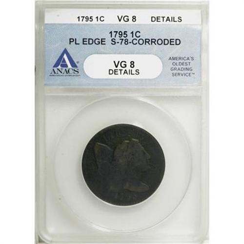 <B>1795 1C Plain Edge--Corroded--ANACS. VG8 Details.</B></I> S-78. NGC Census: (3/96). PCGS Population (13/233). Mintage: 501,500. Numismedia Wsl. Price for NGC/PCGS coin in VG8 : $400. (#1380)<BR><BR><B>Coin Engraver:</B> Joseph Wright<BR><BR><b>Shipping:</b> Coins & Currency (<a target="_blank" href="http://www.heritageauctions.com/common/shipping.php">view shipping information</a>)