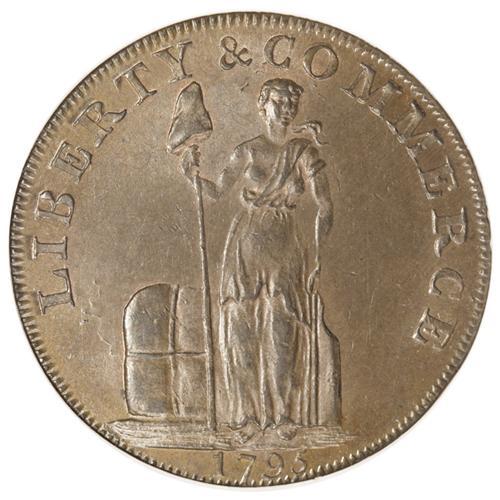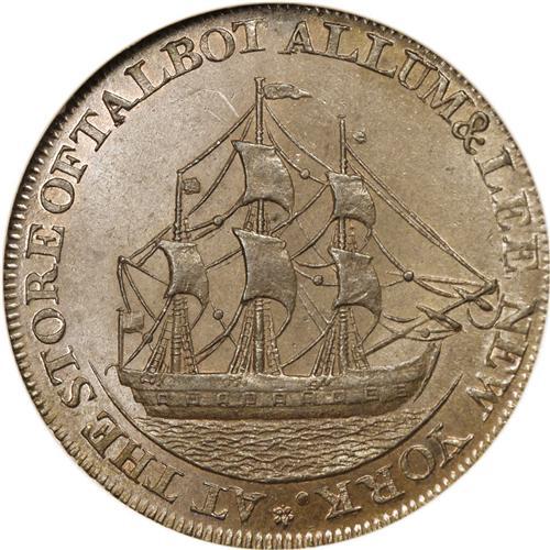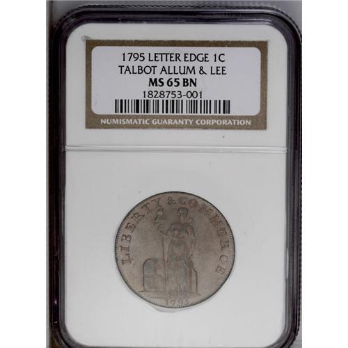 <B>1795<1C> Talbot, Allum & Lee Cent, NEW YORK MS65 Brown NGC.</B></I> Breen-1029, Fuld-2. The variety with large ampersand on the reverse. These trade tokens were of great importance to the young American republic as they were extensively used in the channels of commerce in the 1790s, and many were cut down and used as planchets for half cents in 1795. Very rarely is a TAL encountered with this degree of preservation. The surfaces are glossy with light brown centers and a significant presence of original red still in evidence around the margins. Listed on page 72 of the 2007 <I>Guide Book.</B></I>