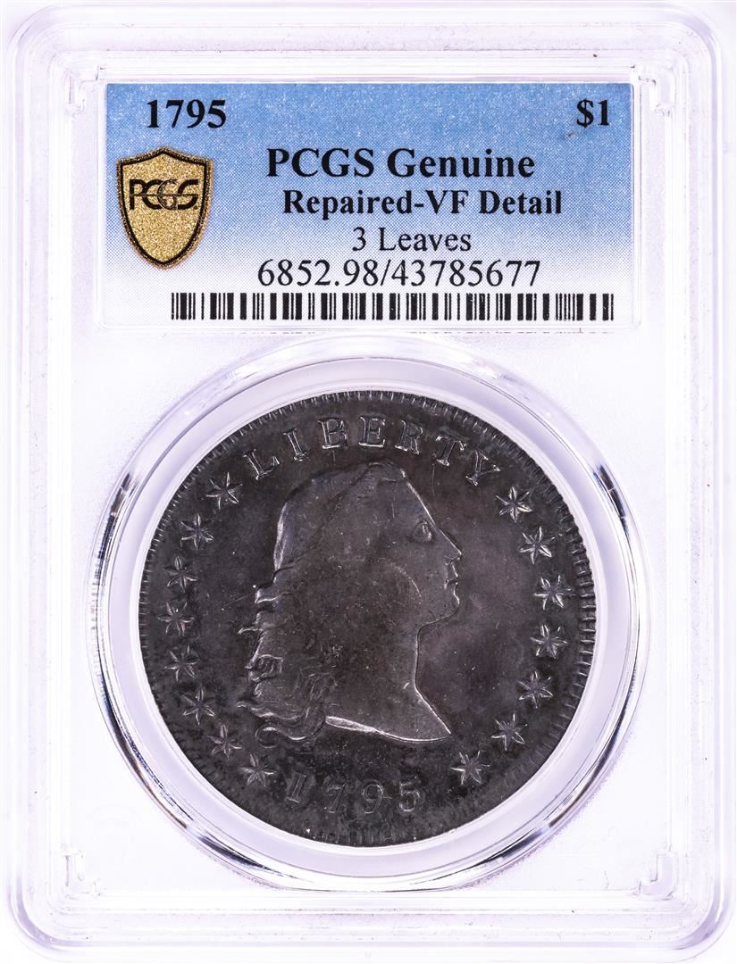 One 1795 3 Leaves $1 Flowing Hair Silver Dollar Coin PCGS VF Details. PCGS Graded.