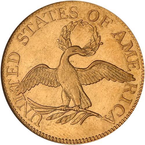 From a low mintage of 8,707 for this date. A well struck, lustrous example of America's first gold coinage. The fields as well as the devices full frosty with gently rolling luster. Only widely spaced marks and hairlines account for the modest grade; without these, a higher numerical grade would be necessary from NGC.