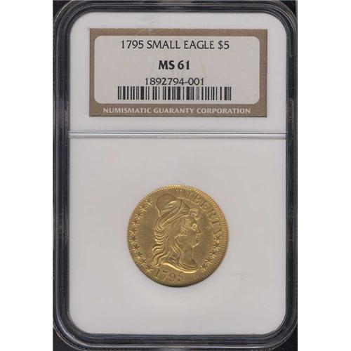 One of the first acts of the new Mint Director, Henry William DeSaussure, after Pres. Washington had appointed him (1795) over his own protests, was to announce his two major ambitions for the Mint. The first of these was to place gold into circulation; the second, to improve all current coin designs. His predecessor, David Rittenhouse, about May 1795, had already ordered Robert Scot to prepare dies for half-eagle coinage. DeSaussure publicized the Mint's readiness to coin deposits of gold, and on July 31 he signed his first delivery warrant, authorizing the Coiner to transfer to the Treasurer of the Mint a batch of 744 half eagles. Between then and Sept. 16 the Mint released 8,707 pieces, thought to comprise 2,749 Wide Dates (Breen encyclopedia estimate) and 5,958 Close Dates. Die life in those days was excessively short die life, requiring the mint to resort to numerous die pairings to get this small number of coins minted. The Director interrupted coinage; otherwise the mintage might have been higher, because he wished the Coiner's Department to begin issue of eagles, or $10 coins.