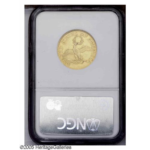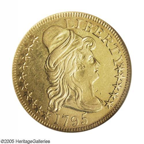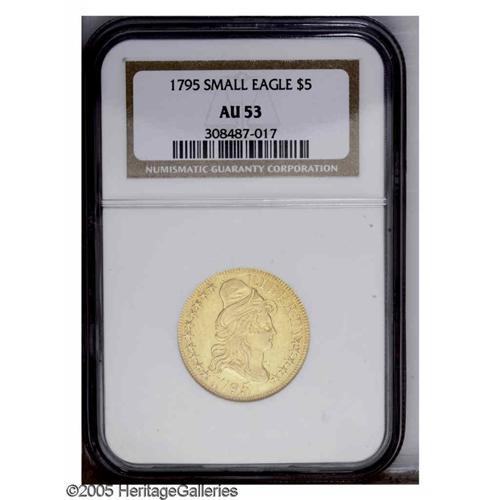 <B>1795<$5> Small Eagle AU53 NGC.</B></I> Breen-6412, B. 1-B, Miller-2, R.4. This distinctive die pairing is most easily distinguished by the crowded stars below the Y in LIBERTY, while on the reverse the final S in STATES is low and touches the wreath, and there are a series of short vertical die lines above TE in UNITED. Always popular as a major type coin regardless of the variety, the Small Eagle reverse was only used for three years and this design displays an artistic merit that is not often seen on early U.S. gold coins. The bright green-gold surfaces show just the slightest friction over the highpoints. Well struck for this type, the only marks worthy of mention are a shallow, horizontal scratch behind Liberty's head and three small planchet voids on the lower right portion of the obverse.<BR><I>From The John H. Schroeder Collection.</B></I>