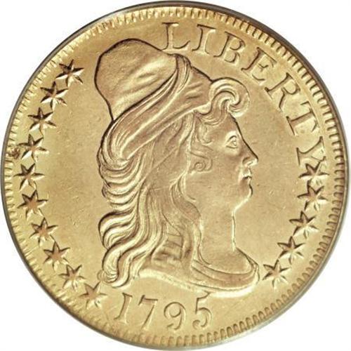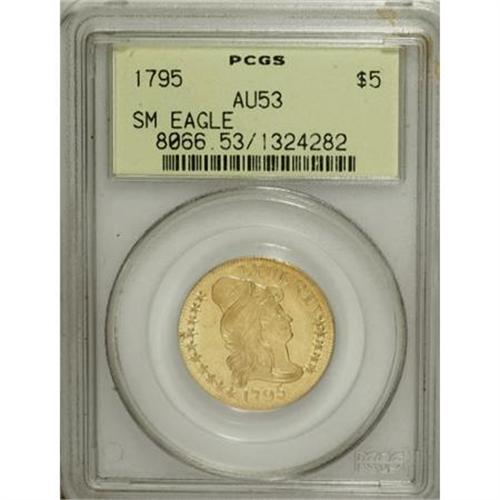 <B>1795 $5 Small Eagle AU53 PCGS.</B></I> Breen-6412, BD-4, R.5. The First U.S. Mint at Philadelphia struck copper half cents and cents in 1793, and silver half dimes, halves, and dollars in 1794. No gold coins were struck until July 1795, partly because of oppressively high surety bonds required of the assayer and chief coiner, and partly because of the greater need for lower denomination coins.<BR> Although the Guide Book reports a mintage of only 8,707 pieces for the 1795 Small Eagle half eagle, that small emission required 12 different die pairings. Three additional 1795 Heraldic Eagle marriages are known, but those were struck circa 1798 using leftover 1795 obverse dies. Among the 12 Small Eagle 1795 varieties, BD-3 is the most common. BD-4 is scarce relative to BD-3, but is among the more available Small Eagle varieties. BD-4 is quickly identified by the placement of the termination of the eagle's wreath, centered beneath the O in OF. On all other 1795 Small Eagle varieties, the wreath terminates to the left of the O.<BR> Breen believed that BD-4 was the first variety struck, but Harry W. Bass, Jr. proved otherwise. BD-2 and BD-4 share the same obverse die, but BD-4 has a die crack from the rim through star 12, while BD-2 lacks this crack. BD-2 and BD-1 share the same reverse die, and since BD-2 is from a later reverse die state than BD-1, the latter is now credited as the first die marriage struck.<BR> BD-4 has two known die states. The star touches the bust in the first die state, which is the case for the present coin. Later, the die was lapped, separating the first star from Liberty's hair. Although BD-4 is the only marriage for the reverse die, it remains perfect on all known examples. <BR> This is a splendid example of the coveted first-year half eagle. Bright luster bathes all protected areas, and the fields have remarkably few abrasions. Faint adjustment marks are limited to the portrait, where they are concealed within the hair. A small circular obverse mark at 3 o'clock serves as an identifier. Housed in a green label holder.<BR><I>From The Chandler Collection.</B></I><BR><BR><B>Coin Engraver:</B> Robert Scot<BR><BR><b>Shipping:</b> Coins & Currency (<a target="_blank" href="http://www.heritageauctions.com/common/shipping.php">view shipping information</a>)