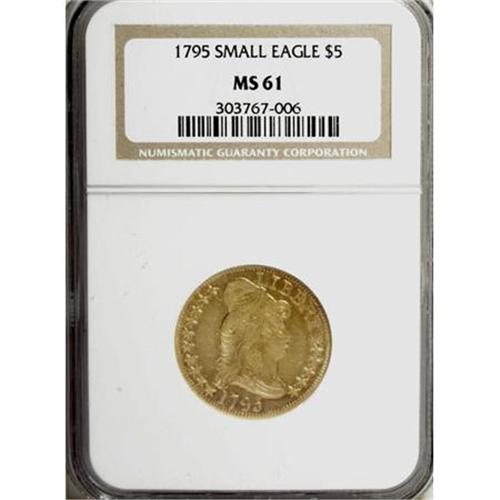 <B>1795 $5 Small Eagle MS61 NGC.</B></I> Breen-6412, BD-3, High R.3. Obverse State C, now lapped. Reverse State B, now with graver's spike above E in UNITED. The obverse is distinguished by the crowded stars below the Y in LIBERTY, while on the reverse the final S in STATES is low and touches the wreath. In the early days of the Republic, the five dollar denomination was considered the most utilitarian gold coin for uses at home and abroad. Early half eagles are roughly divided into two design types, the Small Eagle and Heraldic Eagle. Of the two, the Small Eagle is the earlier and by far the most desirable (as well as rarer) of the two types. There are 12 varieties of the 1795 Small Eagle design, only one of which is an extreme rarity. The BD-3 is the most plentiful Small Eagle five from this year with an estimated 200 examples extant. This, of course, makes the BD-3 1795 a perfect type coin. <BR> This is an exceptionally fine example of this popular, first-year issue from the half eagle series. The fields are satiny indicating a somewhat later impression of this die pairing. Overall, the striking details are strong with just the normally expected softness on Liberty's hair strands and the eagle's breast and neck. Lightly abraded as typically seen for the assigned grade with no singularly mentionable marks on either side. The rich yellow-gold color shows a considerable accent of soft reddish color around the devices on each side.<BR><BR><B>Coin Engraver:</B> Robert Scot<BR><BR><b>Shipping:</b> Coins & Currency (<a target="_blank" href="http://www.heritageauctions.com/common/shipping.php">view shipping information</a>)