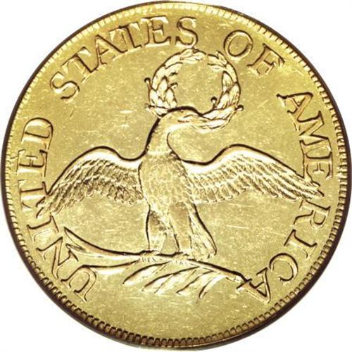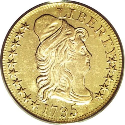 <B>1795 $5 Small Eagle MS61 PCGS.</B></I> Breen-6412, BD-3, High R.3. Star 11 is solidly joined to Y and star 12, diagnostic for the obverse. The left branch of the wreath has a leaf joined to the final S with the right branch separated from the O, diagnostic for the reverse. The obverse appears to be state b, with a die crack from the border to star 12, continuing faintly into the field from the inner point of the same star. The reverse appears to be uncracked, with an engraving line from a dentil to the right top of E in UNITED. This may be the same feature that Dannreuther calls a crack in his state b. Die state analysis and emission sequence study indicate that BD-3 was probably the third variety coined in the late summer of 1795.<BR> The BD-3 die combination is far more plentiful than any other 1795 variety, an ideal choice for date and type collectors. John Dannreuther estimates more than 200 examples exist, consistent with our estimate. Our own survey of auction records leads us to believe that about two dozen Mint State examples of the variety still exist today, mostly in the MS60 to MS63 range. This example compares favorably to most of the finest survivors.<BR> Brilliant greenish yellow-gold surfaces exhibit satiny luster. Clean surfaces and excellent eye appeal help to define the grade. Slight surface roughness near the date appears to be the result of improperly mixed alloy that creates slight lamination in that area. Population: 18 in 61, 47 finer (3/08).<BR><BR><B>Coin Engraver:</B> Robert Scot<BR><BR><b>Shipping:</b> Coins & Currency (<a target="_blank" href="http://www.heritageauctions.com/common/shipping.php">view shipping information</a>)