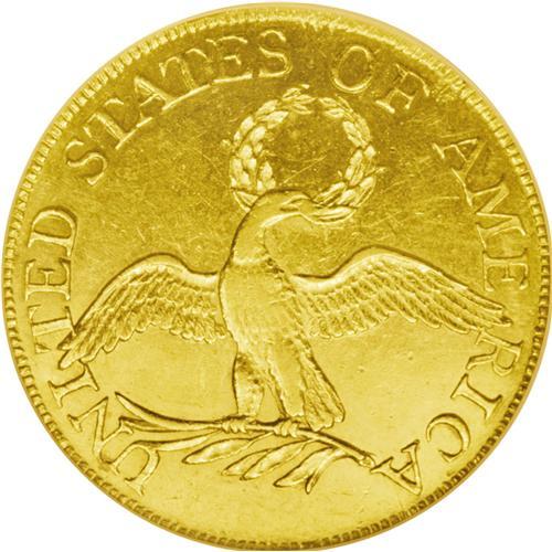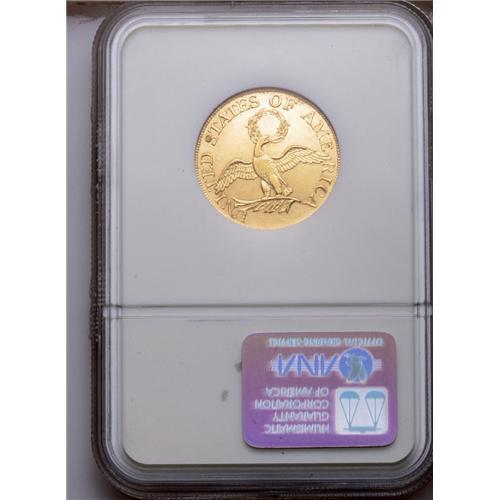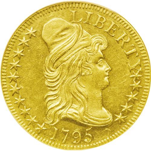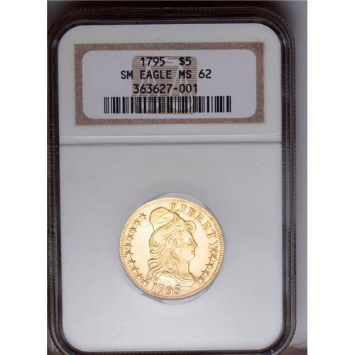 <B>1795<$5> Small Eagle MS62 NGC.</B></I> B. 1-C, Breen-6412, Miller-3, Bass-3034, R.6. Stars 11, 12, and Y are all solidly joined. The branch is separated from S and O with the terminal leaves of each branch joined below the space between those letters. This is a rare die marriage, solidly in the middle R.6 range. As a type, the Small Eagle half eagles were produced from 1795 to 1798, and the 1795 dated coins are the usually seen representatives of this coin design. The current surviving population is greater than any other date in the series, and is actually greater than all other dates in the series combined. Despite this fact, there are less than 1,000 examples of this date still in existence today.<BR> This is an important issue as the 1795 half eagles were the first gold coins produced at the Philadelphia Mint, after initial gold deposits were made in July of that year. The initial production took place late in July, with 744 half eagles delivered on July 31. Numerous dies were made for the 1795 half eagle coinage, including at least 10 obverse dies and nine reverse dies for the Small Eagle coinage alone. Two of the obverse dies were not actually used during the first year of gold coinage, but were overdated in 1796 and 1797.<BR> Our firm has sold several dozen 1795 Small Eagle fives over the past decade and only once before have we offered an example of this variety--the identical coin being offered again today. This splendid example displays bright yellow-gold surfaces with a fair degree of reflectivity in the areas surrounding the devices. The strike is well executed save for weakness down the center of the eagle. A bit of scuffiness in the exposed areas limits the flow of reflective luster and, thus, the grade. Any 1795 Small Eagle in Mint State is a prize for the advanced gold collector, but the addition of the elusive die variety should make this a hotly cont