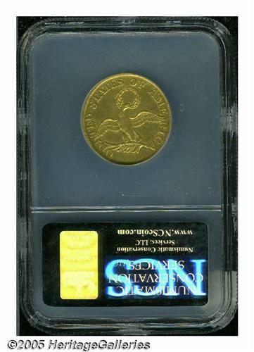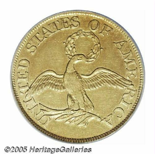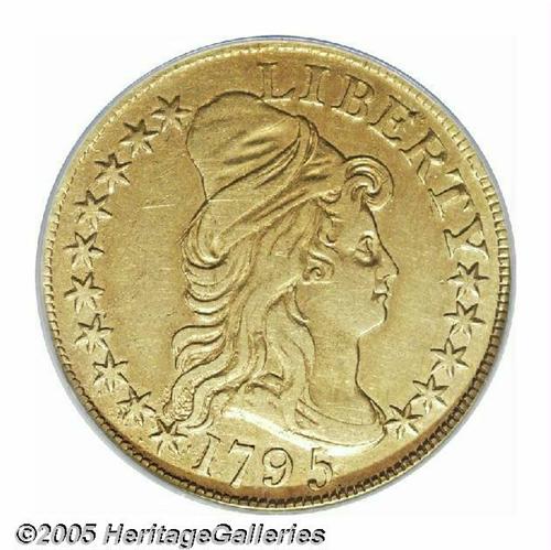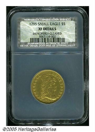 <B>1795<$5> Small Eagle XF Details, Improperly Cleaned, NCS.</B></I> Breen-2C, Breen-6412, Bass-3035, Miller-4, R.5. This variety is generally recognize by extensive die rust at the lower obverse, especially in the lower hair curls and drapery. Similarly, a small patch of die rust at the right top of F in OF identifies the reverse. The surfaces on both sides have a slightly glossy or reflective appearance from cleaning. Light yellow-gold tends toward green with splashes of attractive rose toning. The surfaces have very light hairlines as well as minor abrasions; however, this is much nicer than the description suggests. The gold half eagle was our nation's first gold coin, and some consider this variety to be the first of 12 varieties produced with the 1795 date. Mint records suggest that 8,707 examples were produced, that being the total number of half eagles struck in 1795. It is most likely the case that some of the 6,196 coin 1796 mintage were dated 1795. We believe the actual mintage is in the neighborhood of 13,000 coins.<BR><I>From the Dr. Kurt Peters Collection.</B></I> From the Dr. Kurt Peters Collection.