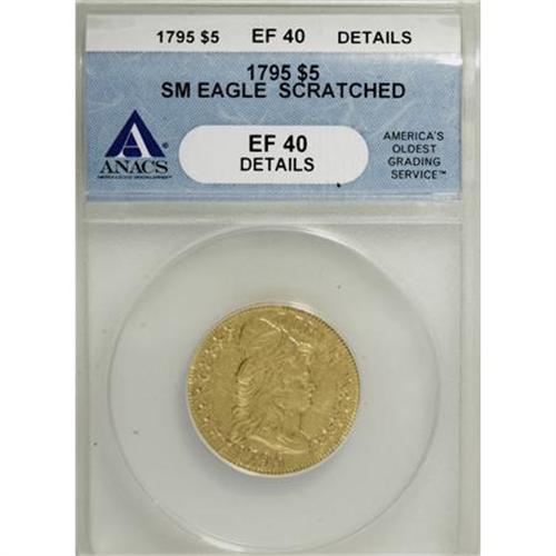 <B>1795 $5 Small Eagle--Scratched--ANACS. XF40 Details.</B></I> Breen-6412, BD-3, High R.3. 1795 saw the first issues of US gold both in the half eagle and eagle denominations. BD-3 is the most plentiful variety of this date, and one that is generally destined for type collectors. The scratches referred to on the holder appear to be a patch to the left of the date, yet they do not interfere with the eye appeal of this coin in the slightest. The expected amount of wear is visible on the highest points of Liberty's hair and the eagle's body. Pale olive-gold in color, with traces of luster still remaining in some of the recessed areas.<BR><BR><B>Coin Engraver:</B> Robert Scot<BR><BR><b>Shipping:</b> Coins & Currency (<a target="_blank" href="http://www.heritageauctions.com/common/shipping.php">view shipping information</a>)
