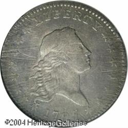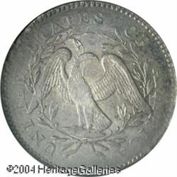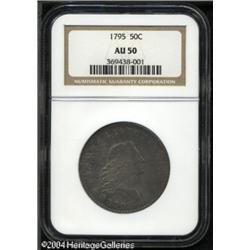 1795 50C 2 Leaves AU50 NGC. O-124, R.5. Star 15 is <B>1795 50C 2 Leaves AU50 NGC.</B></I> O-124, R.5. Star 15 is attached to the bust, and a point of the first star pierces the lowest curl. The variety is further confirmed by a die defect lump in the lower right reverse field. The surfaces are toned a light to medium gray, and reveal several obverse adjustment marks, mostly at the peripheries. A couple of shallow scratches and minor scrapes are also noted on each side. The motifs are generally well centered on the planchet, and most of the dentilation shows, except where interrupted by the adjustment marks, especially along the left obverse border. The design elements are for the most part well impressed, with nice definition showing in Liberty's hair, and in the eagle's wing and neck feathers. The tops of the letters in AMERICA are weak, as are the eagle's breast and leg feathers. Overall, this is a very pleasing early half dollar, worthy of a generous bid. <BR><BR><B>Important notice:</B> Heritage usually auctions material at the rate of 200-250 lots per hour. On some occasions eBay Live bid software or the Internet may not be able to keep up with the pace of the auction. We recommend placing a realistic absentee bid now as insurance to avoid disappointment. Occasionally the auctioneer may eliminate or reject an eBay Live bid, and the auctioneer may also reopen a lot after the close of the eBay live bidding (usually because we missed an audience bid), and may reject your bid even if it shows you as the winning bidder. By bidding via eBay Live, you agree that Heritage may award the lot to another bidder at its sole discretion under the circumstances described above or any other reasonable circumstances. Since eBay bids are not shown to us until we open the lot on the floor, we treat those bids just like floor bids. In most cases the floor responds before the eBay bid is presented to us, due to Internet lag time, so for consistency we have made it a policy that floor bids are always considered first over tie eBay live bids. Also please note that all Heritage lots purchased through eBay Live carry a 20% Buyer's Premium. Please make sure you read the Terms and Conditions before you bid. This lot is being auctioned in conjunction with a live floor auction by Heritage Galleries & Auctioneers. All final auction and invoice information will be supplied by Heritage Galleries & Auctioneers, and all other information should be considered preliminary. Lot:6032