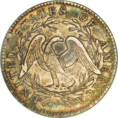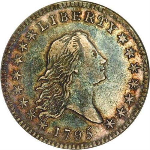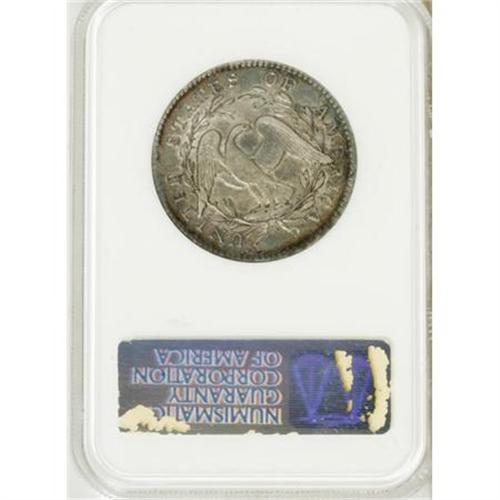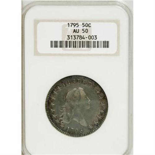<B>1795 50C 2 Leaves AU50 NGC.</B></I> O-105, R.4. Two points of star 1 touch the lowest curl, the base of 1 is higher than 795, there are 10 berries left and seven right, and three berries under the ST of STATES.<BR> Splashes of aqua-blue and reddish-tan in the obverse central area are framed by peripheral electric-blue, violet, and tan, while the reverse is dominated by champagne-gray in the center, flanked by whispers of reddish-orange, aqua-blue, violet, and lilac. The dentils are bold, particularly on the obverse. Liberty's hair is sharp, and most of the eagle's wing feathers are strong. Some faint linear marks are noted between stars 5 to 8, and a couple of adjustment marks are visible in the lower right reverse quadrant.<BR><BR><B>Coin Engraver:</B> Robert Scot<BR><BR><b>Shipping:</b> Coins & Currency (<a target="_blank" href="http://www.heritageauctions.com/common/shipping.php">view shipping information</a>)