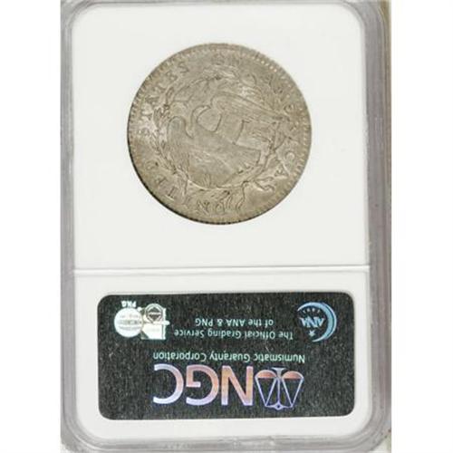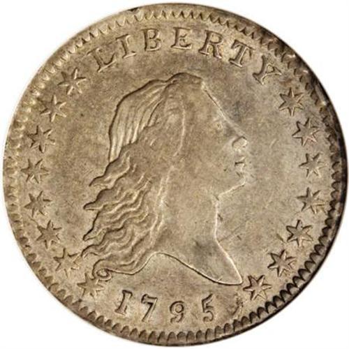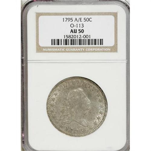 <B>1795 50C 2 Leaves AU50 NGC.</B></I> O-113, R.3. A over E in STATES. Obverse star 1 pierces Liberty's lowest hair curl. A rough die break that resides between star 15 and the date is one of the two chief diagnostics for this variety, the other being the A in STATES prominently repunched over a previous E. A die crack is beginning to form across the tops of LIBERTY, indicating an intermediate die state between O-113 and O-113a. <BR> Apparently the sixth finest known O-113 half dollar. The dove-gray surfaces reveal golden accents near the borders, representing traces of the coin's original mint luster. The right obverse border has visible disturbances that represent improper operation of the Castaing machine, with the lettering not properly centered on the edge of the planchet.<BR> Haseltine-5; Beistle 5-I; Overton-30; Hilt 15-Q; PCGS# 6052; Encyclopedia-4559.<BR><I>Ex: Alpine Numismatics (11/1999).<BR>From The Westmoreland County Collection of Early Bust Halves, 1794-1807.</B></I><BR><BR><B>Coin Engraver:</B> Robert Scot<BR><BR><b>Shipping:</b> Coins & Currency (<a target="_blank" href="http://www.heritageauctions.com/common/shipping.php">view shipping information</a>)