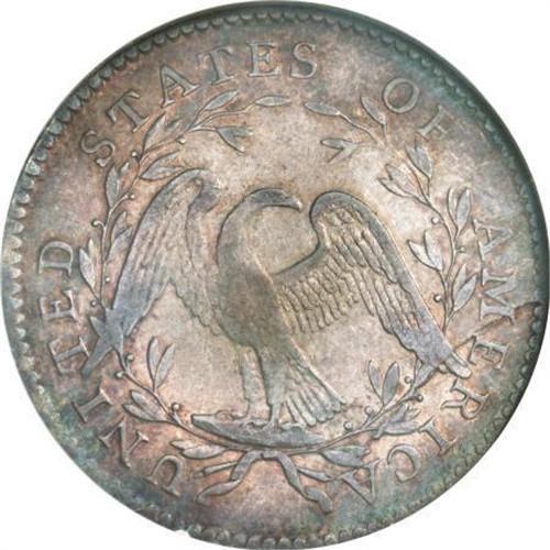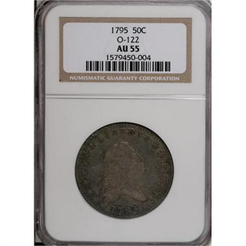 <B>1795 50C 2 Leaves AU55 NGC.</B></I> O-122, R.5. The following confirm the variety: star 15 touches bust, star 1 barely penetrates the lowest curl, nine berries are on the left branch and eight on the right, with four under the left (right facing) wing, and a heavy die break through the M of AMERICA, the lower wing, and the base of the final A.<BR> Light gray and red-gold toning occupies the centers, framed by lavender and electric-blue at the peripheries. Well centered design elements display sharp detail, enhancing the coin's overall eye appeal. Clean surfaces reveal light clash marks under Liberty's chin and faint adjustment marks in the upper left obverse quadrant.<BR><BR><B>Coin Engraver:</B> Robert Scot<BR><BR><b>Shipping:</b> Coins & Currency (<a target="_blank" href="http://www.heritageauctions.com/common/shipping.php">view shipping information</a>)